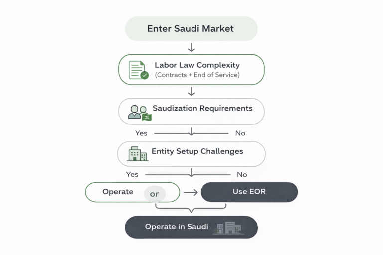 But here’s the thing nobody tells you upfront: the compliance environment in Saudi Arabia is one of the most demanding in the region. Labor law is detailed and strictly enforced. Saudization quotas can catch you off guard if you haven’t planned for them. Setting up your own legal entity takes the better part of a year and requires capital most companies would rather deploy elsewhere.